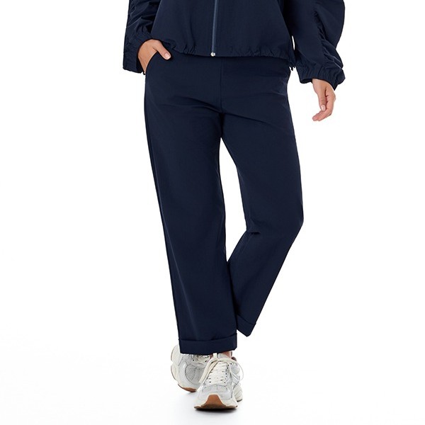 Calça de modelagem reta, com caimento confortável e elegante. Possui bolsos funcionais e cós com elástico, garantindo praticidade no dia a dia. A dobra na barra adiciona um toque moderno e estiloso à peça.