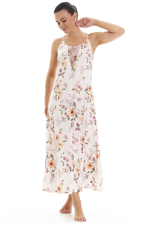 Camisola longa de alcinha com alças reguláveis, proporcionando ajuste perfeito e conforto. Possui delicado detalhe em tule, que adiciona um toque de charme e feminilidade à peça.