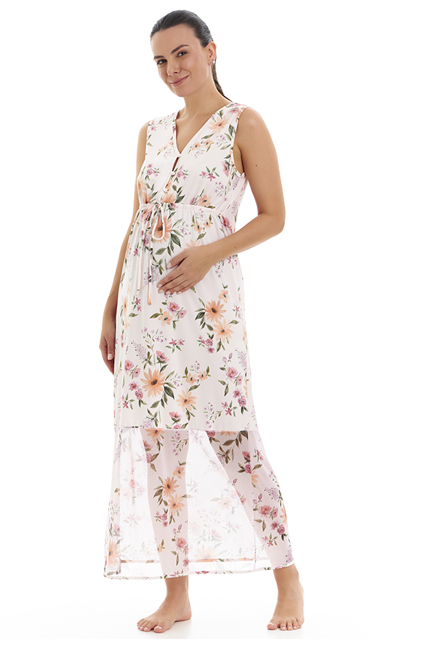Camisola longa estilo regata. Possui botões de pérola que facilitam a amamentação com discrição e charme. O amarril abaixo do busto valoriza a silhueta, enquanto os delicados acabamentos em tule proporcionam um toque suave e feminino.