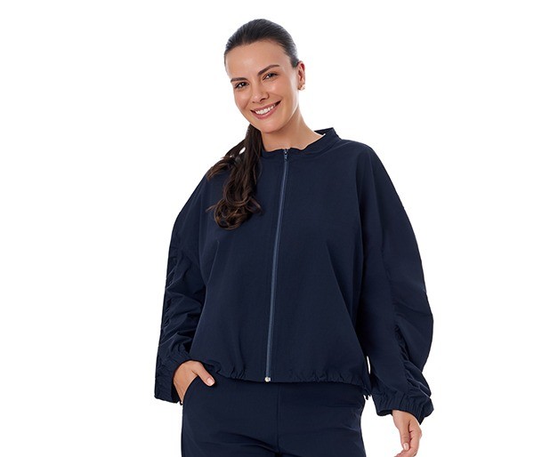Jaqueta com zíper frontal e pequena gola super charmosa. Possui franzido nas costas, que traz um toque delicado ao visual, além de mangas com franzidos e elástico nos punhos, garantindo conforto e praticidade no dia a dia. Conta também com elástico na barra, permitindo ajustar a peça conforme preferir e proporcionando um caimento mais confortável e versátil.