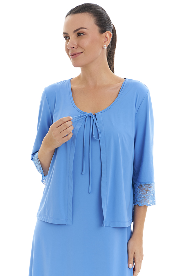 Liseuse com mangas 3/4 e amarração, proporcionando um caimento elegante e confortável. O delicado detalhe de renda adiciona um toque de charme e sofisticação à peça. Produzido com o fio AMNI Soul Eco da Rhodia Solvay, o primeiro fio de nylon certificado 6.6 biodegradável do mundo.