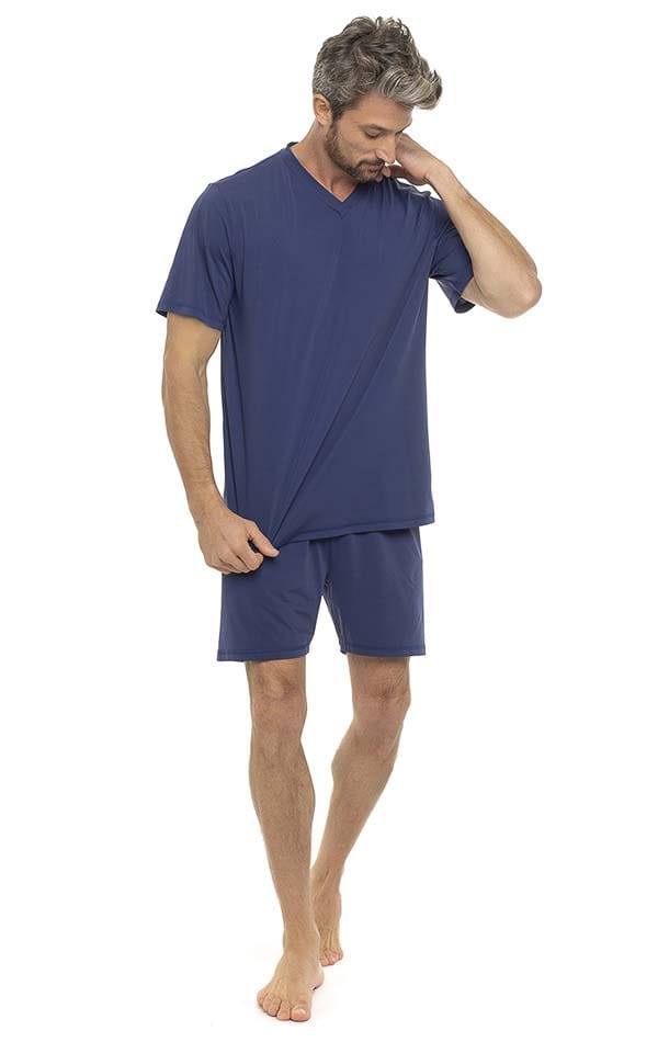 Pijama masculino curto em fluity liso. Blusa decote V e shorts.