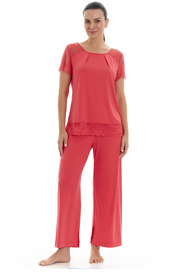 Pijama de manga curta com gola redonda e calça com modelagem ampla. O delicado detalhe de renda e as pregas adicionam um toque de charme e sofisticação à peça, garantindo conforto e elegância em todos os momentos. Produzido com o fio AMNI Soul Eco da Rhodia Solvay, o primeiro fio de nylon certificado 6.6 biodegradável do mundo.