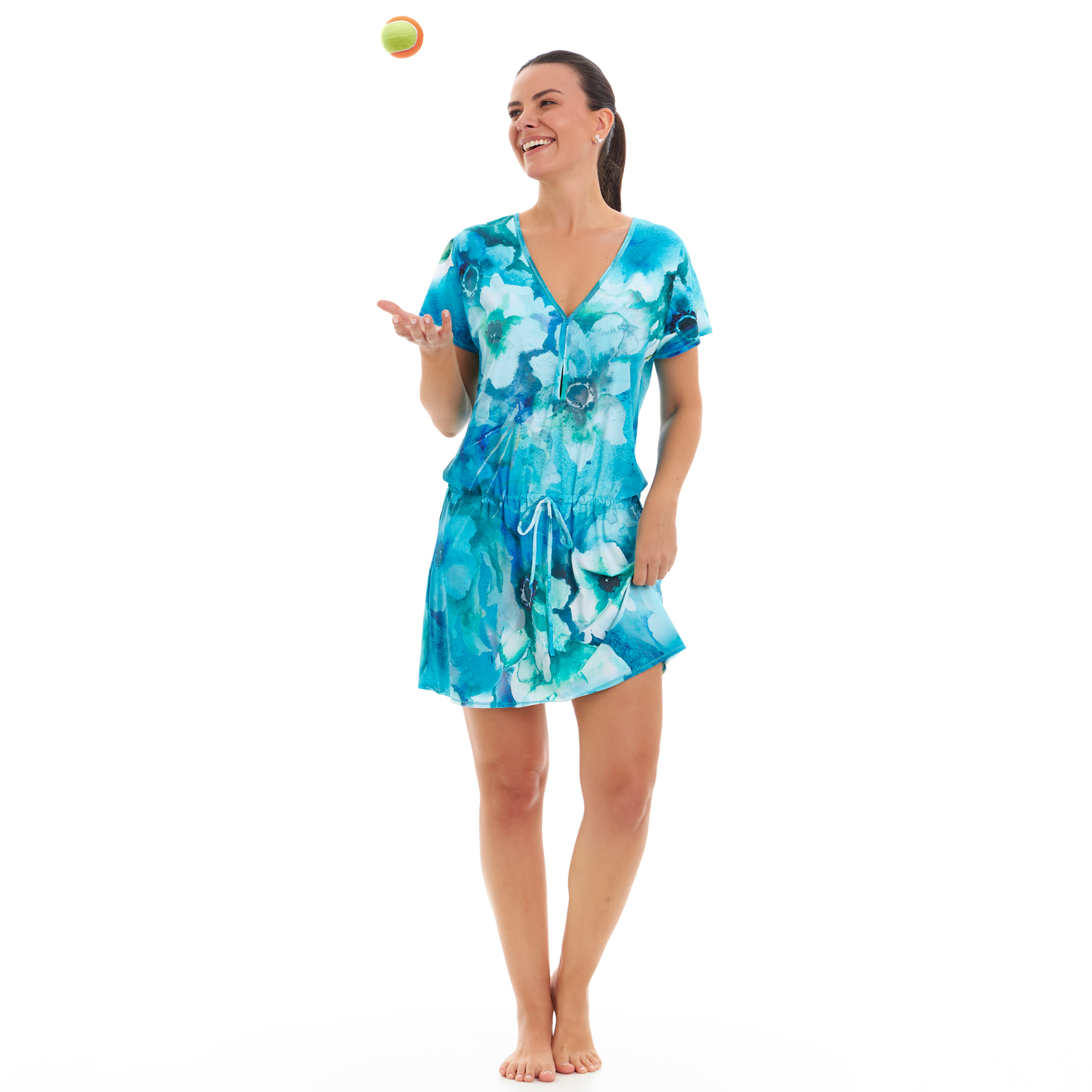 Saída de praia leve e elegante, com decote em V, mangas curtas e amarração na cintura que valoriza a silhueta.O recorte abaixo do busto valoriza a peça, deixando o caimento super elegante. Perfeita para compor looks frescos e cheios de estilo. Confeccionada em fluity (malha fria). Produzido com o fio AMNI Soul Eco da Rhodia Solvay, o primeiro fio de nylon certificado 6.6 biodegradável do mundo.